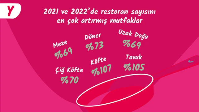 Restoran istatistikleri konusunda da Yemeksepeti verilerinde ilgi çekici detaylar ortaya çıktı. Geçen sene 6 bin 700 adet olan döner restoranı sayısı bu sene 11 bin 561’e çıktı. Yüzdesel olarak en büyük artış ise yüzde 106 ile köfte mutfağı restoranlarında yaşandı ve köfte satan restoran sayısı iki katına çıktı. Tavuk döner restoran sayısında da geçen seneye oranla yüzde 104’lük bir artış söz konusu oldu.