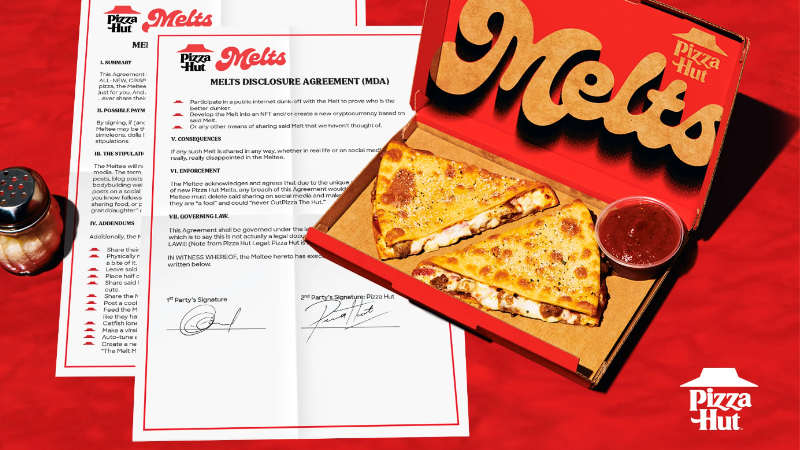 Pizza Hut, kampanya kapsamında Melts adını verdiği yeni tek dilimlik atıştırmalığının sosyal medyada paylaşılmaması için bir ifşa sözleşmesi yaparak müşterilere para teklif ediyor…